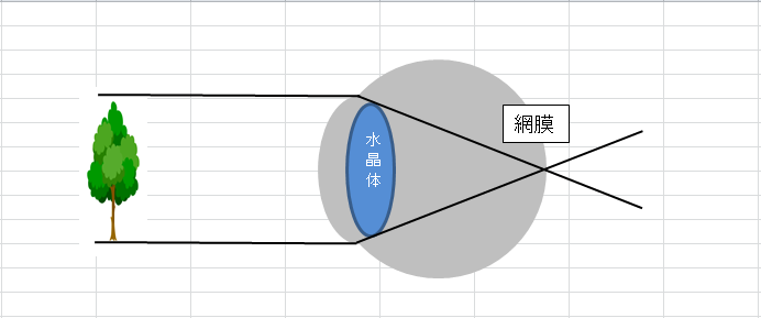 遠方からの光は、網膜上、もしくは網膜により近い場所にて結ばれています。遠くが良く見える人や、遠くが良く見える眼鏡を掛けた人が遠くを見ている時は、眼の力は使っていない状態で見ています。