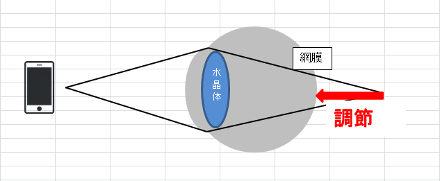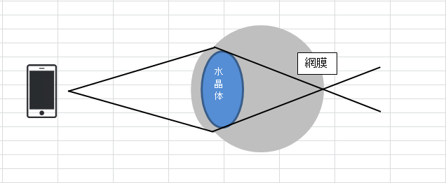 30~40cm離れたスマートフォンなどを見た時、ピントは網膜よりも奥に合うため、そのままではぼやけてしまいます。