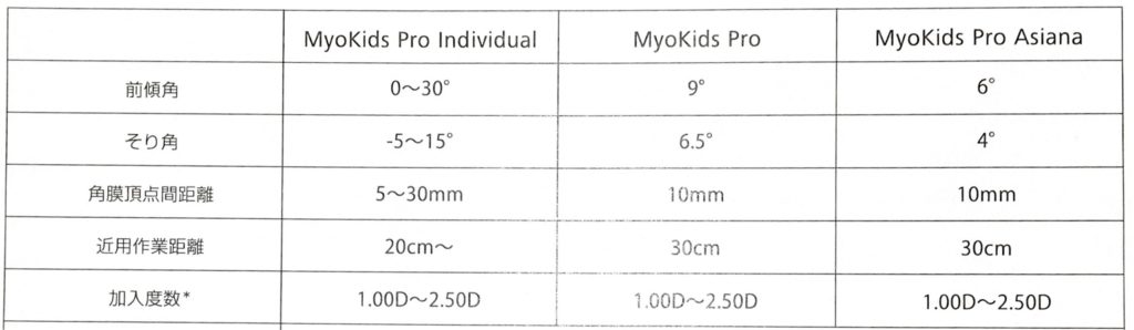 それぞれ、前傾角、そり角、角膜頂点間距離の設定が異なります。