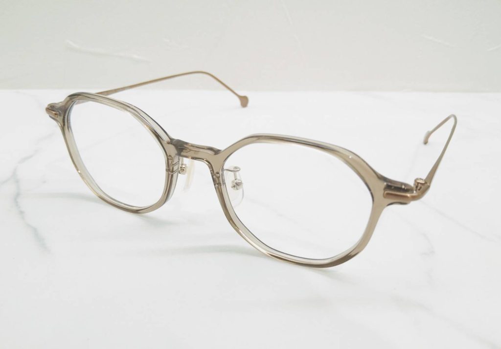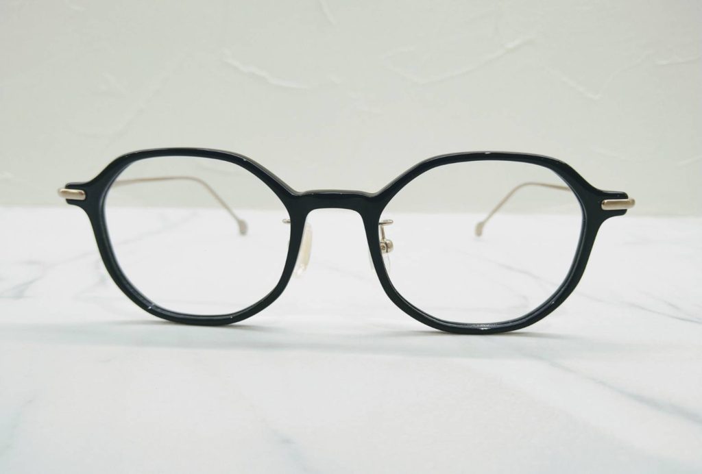 多角形のセルロイドフロントにチタンテンプルのみのシンプルなコンビネーションフレーム。