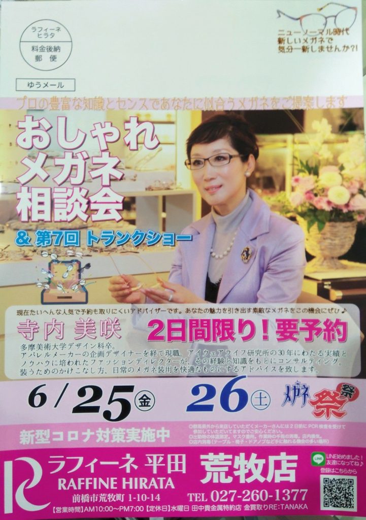 今年もやります!メガネ祭り♫第7回トランクショー&寺内先生のおしゃれメガネ相談会♬ – 群馬県前橋市のメガネ、補聴器ならラフィーネヒラタ|スタッフブログ (megane-r-hirata.com)