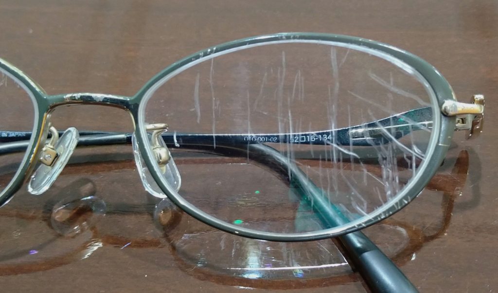 フレームの曲がりや折れてしまった場合は調整や修理でどうにか出来るのですが、レンズの傷はついてしまうとどうしようも出来ないのでレンズを新しくするしかありません。