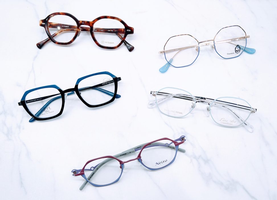 多角形フレームは、リムの形が6角形(ヘキサゴン)や8角形(オクタゴン)などの角が多いデザインのもので、国内外問わず様々なブランドから出ている、今最も注目されているメガネフレームです!!